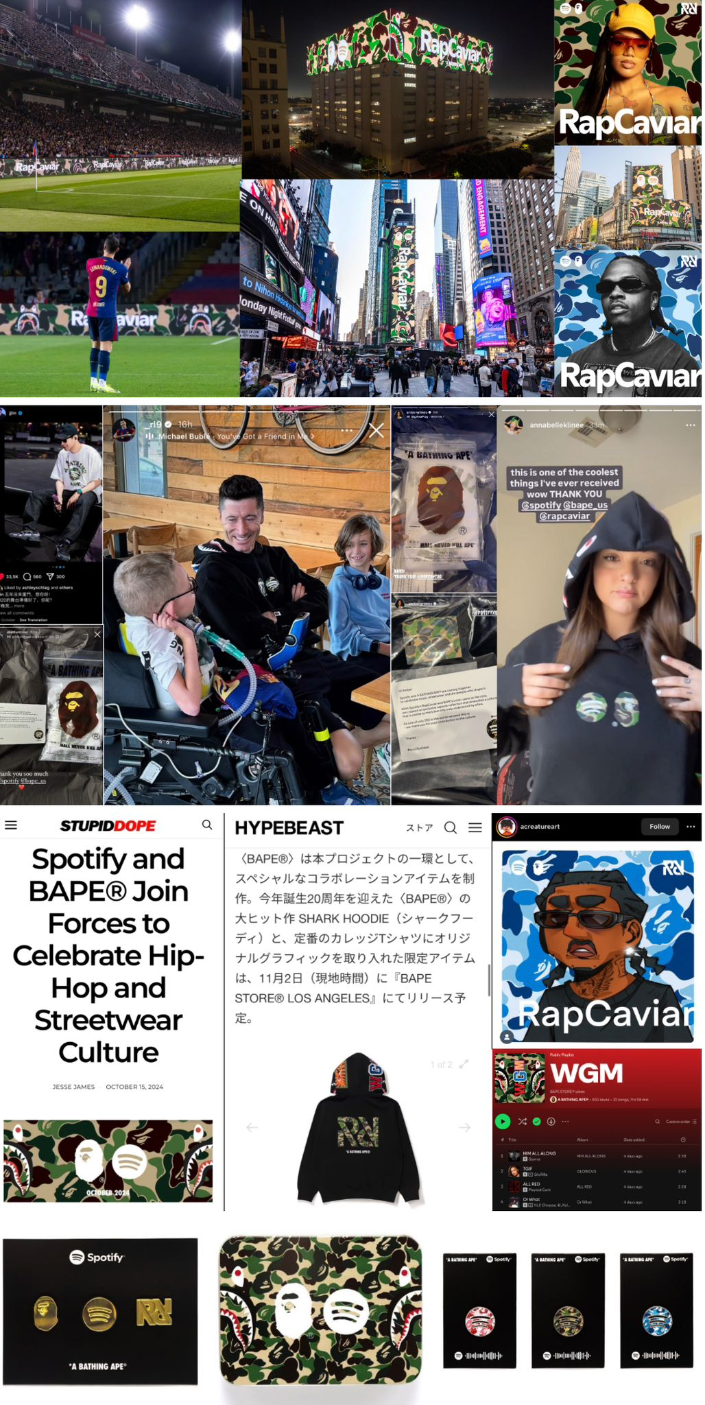 Leading creative across global partnerships and cultural collaborations at Spotify is always an opportunity to bring world-class brands and culture-shaping creative together in ways that are surprising, impactful, and powerful. It allows us to give fans something that goes beyond just one genre. In the case of BAPE, we were able to orchestrate multiple collabs to date, between Rap Caviiar, our Hip Hop Playlist Fandom and a highly coveted global streetwear fashion icon with roots in Japan. Fans went crazy for the limited edition apparel and hype that was built around the launches of both drops, lining up to experience the coming together of two of their favorite brands and get closer to the community they belong to.